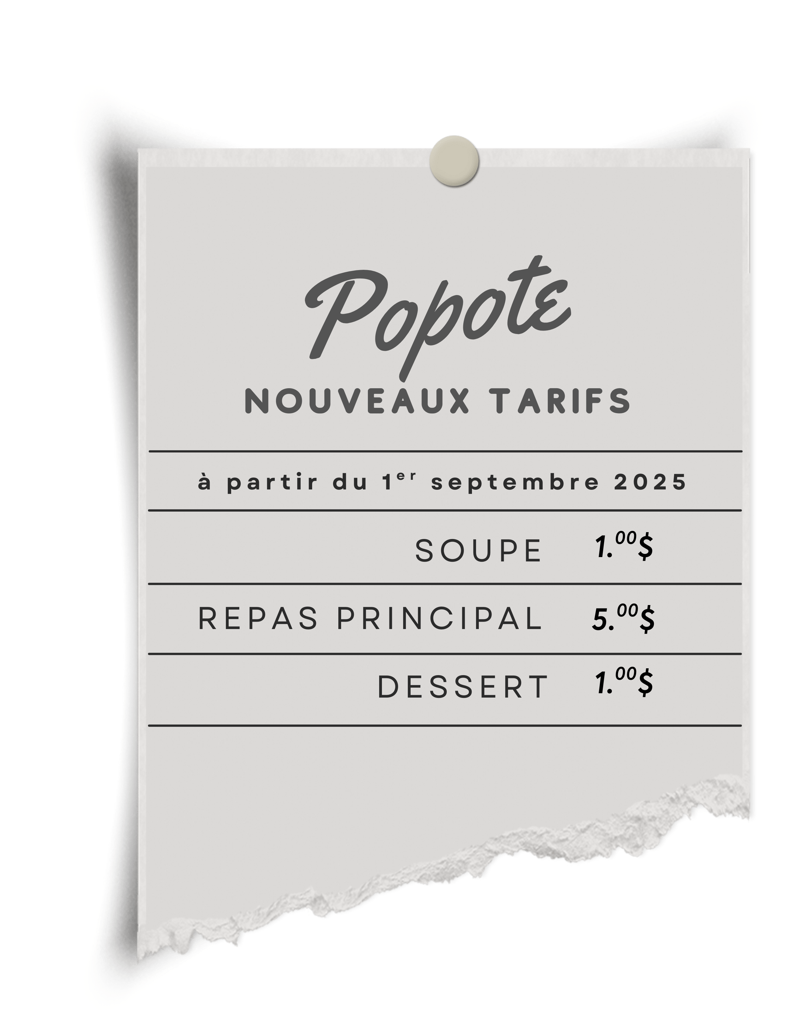 - Repas complet (soupe, plat principal et accompagnements, dessert) : 7 $